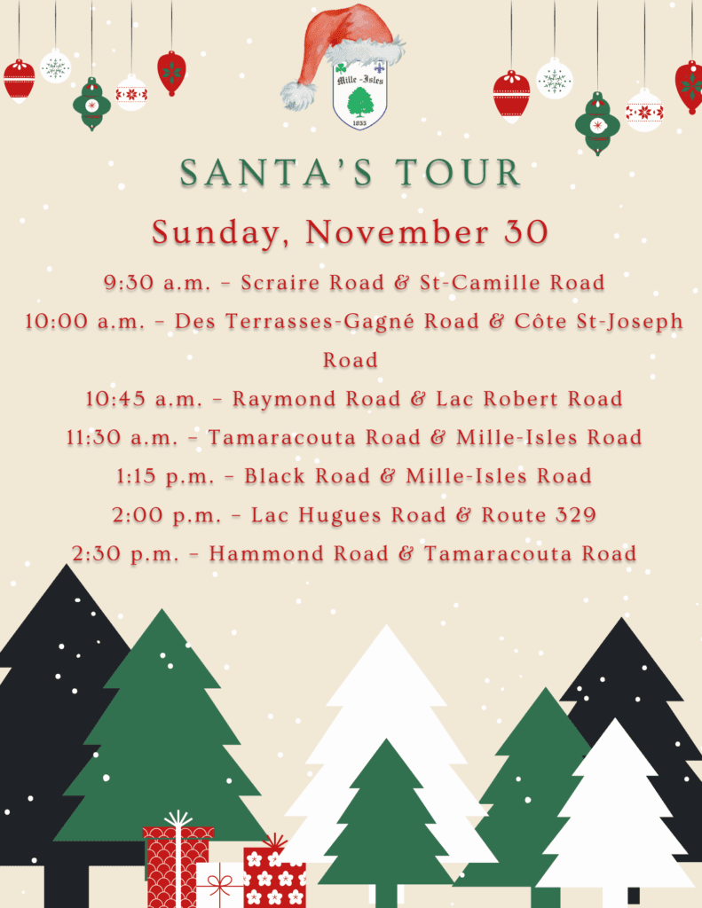 Regular meetings of Municipal Council are held on Wednesdays at Town Hall located at 1262 Mille-Isles Road and begin at 7:00 p.m. unless otherwise noted.